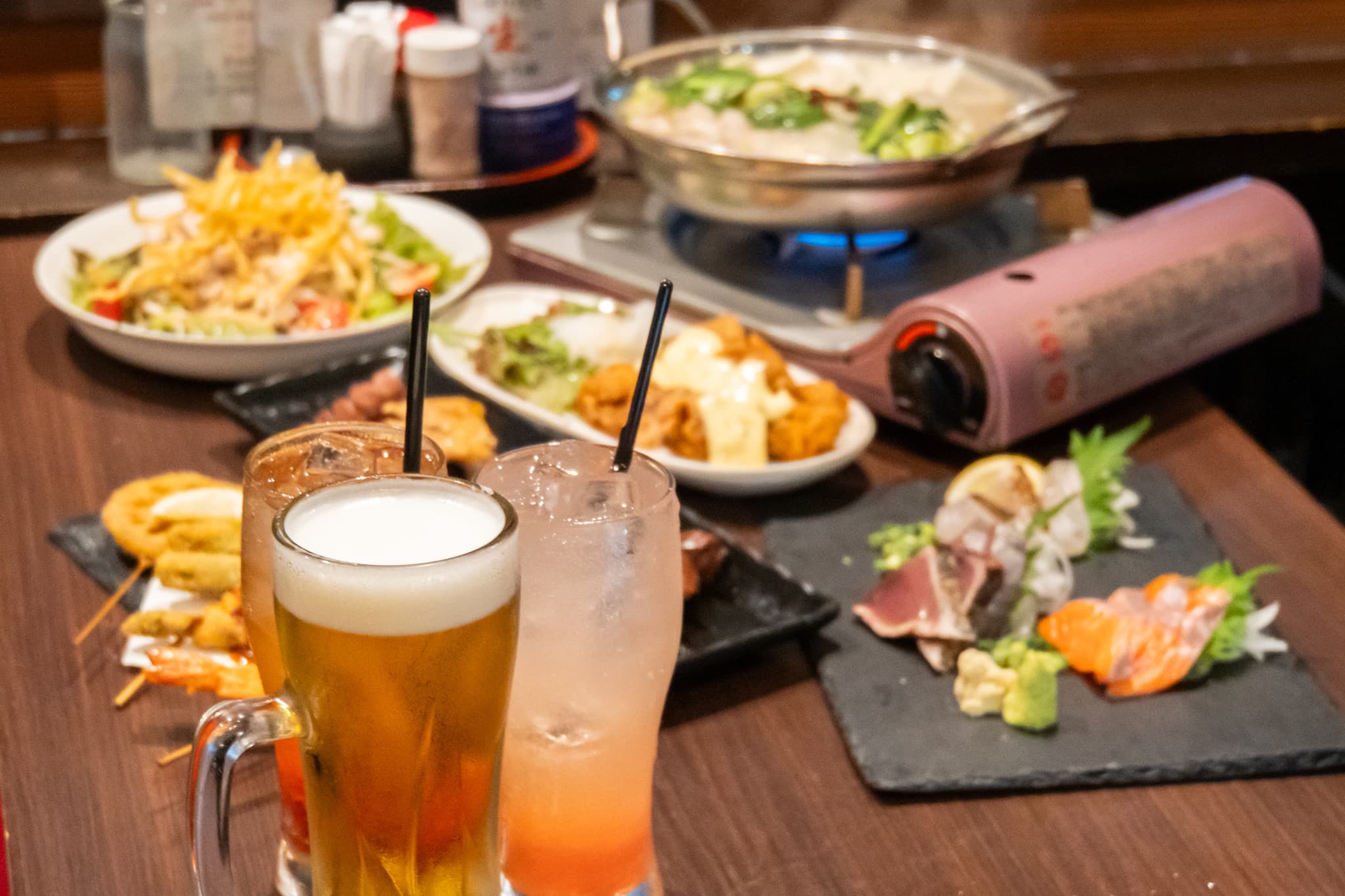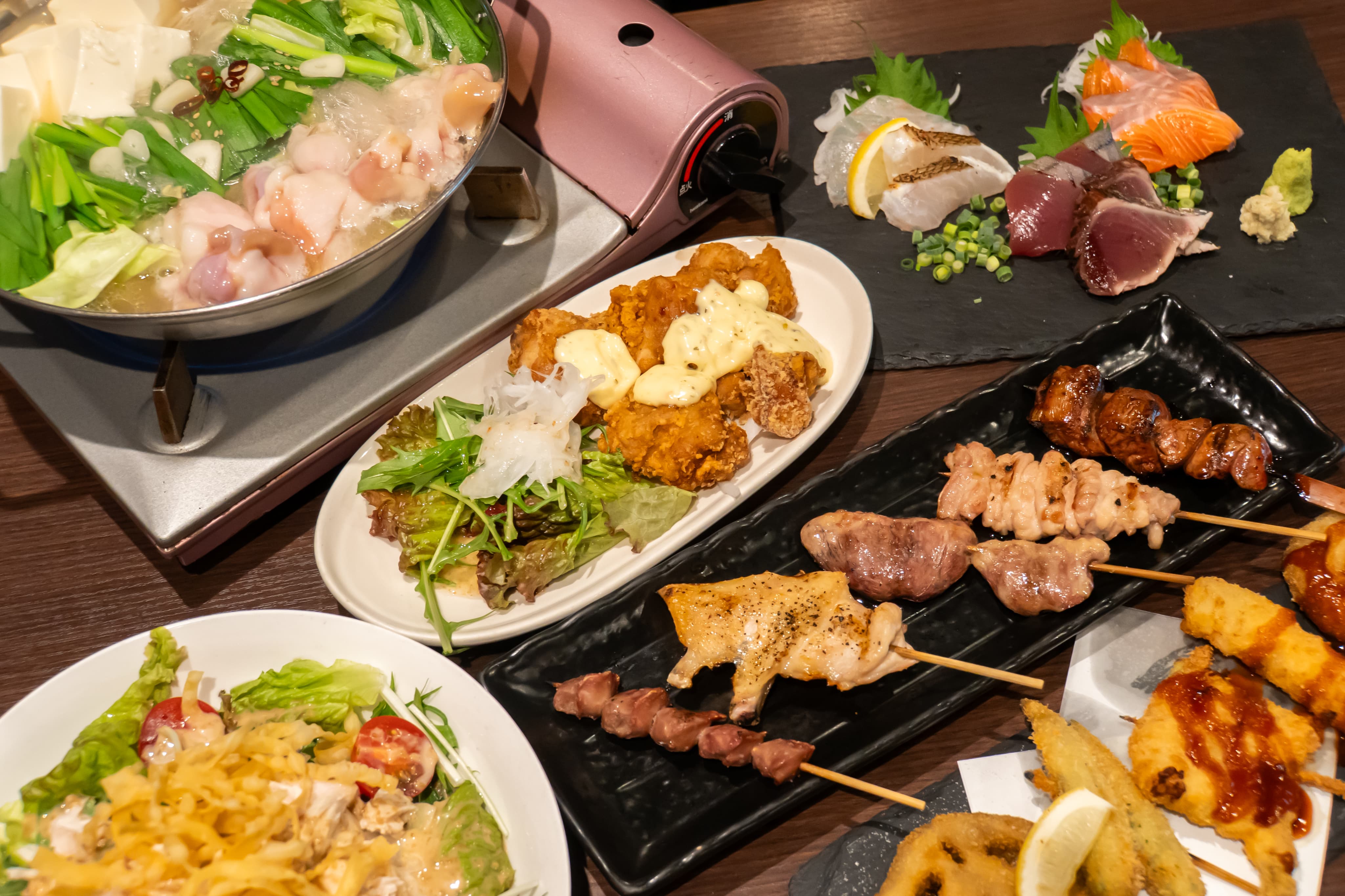 名物の串揚げや、自慢のもつ鍋をはじめとして、 丹念に仕上げたお料理がテーブルを華やかに彩ります。居心地の良い空間で、美味しいお酒と極上のお料理を心ゆくまでお楽しみください。